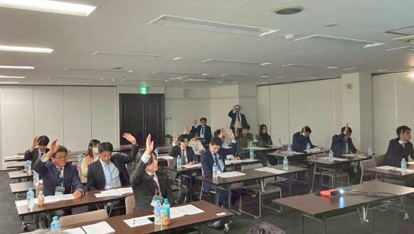 令和7年4月18日(金) 東京文具共和会館(東京都台東区)において、青年部会の第14回通常総会を行いました。当日は鈴木康彦青年部会会長が挨拶を行い、続いて三宅勇雄理事長より組合の活動方針や青年部会に対する期待などのお話を頂きました。議長には堀慎司幹事が任命され会員協力の下、無事に過半数を超える委任状が集まり予定されていた4つの議案全てが滞りなく承認されました。